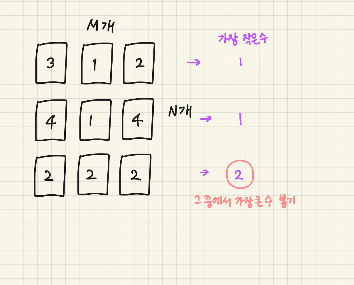 ๐ฅฆ ๋ฌธ์ ํด๊ฒฐ ์์ด๋์ด : ๊ฐ ํ๋ง๋ค ๊ฐ์ฅ ์์ ์๋ฅผ ์ฐพ์ ๋ค์ ๊ทธ ์ ์ค์์ ๊ฐ์ฅ ํฐ ์๋ฅผ ์ฐพ๋ ๊ฒ