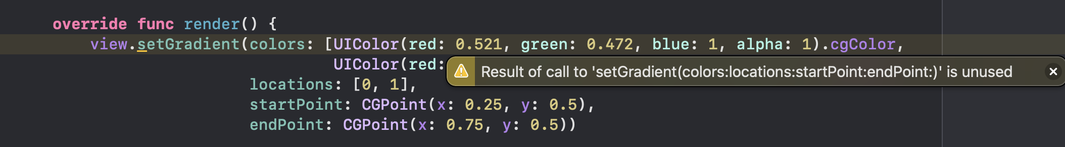 - ์์ ์์์ ๊ฐ์ด ํด๋น ํจ์ ์๋ถ๋ถ์ @discardableResult ์ ๋ถ์ฌ์ฃผ๋ฉด ๊ฒฝ๊ณ ๊ฐ ์ฌ๋ผ์ง๋๋ค !