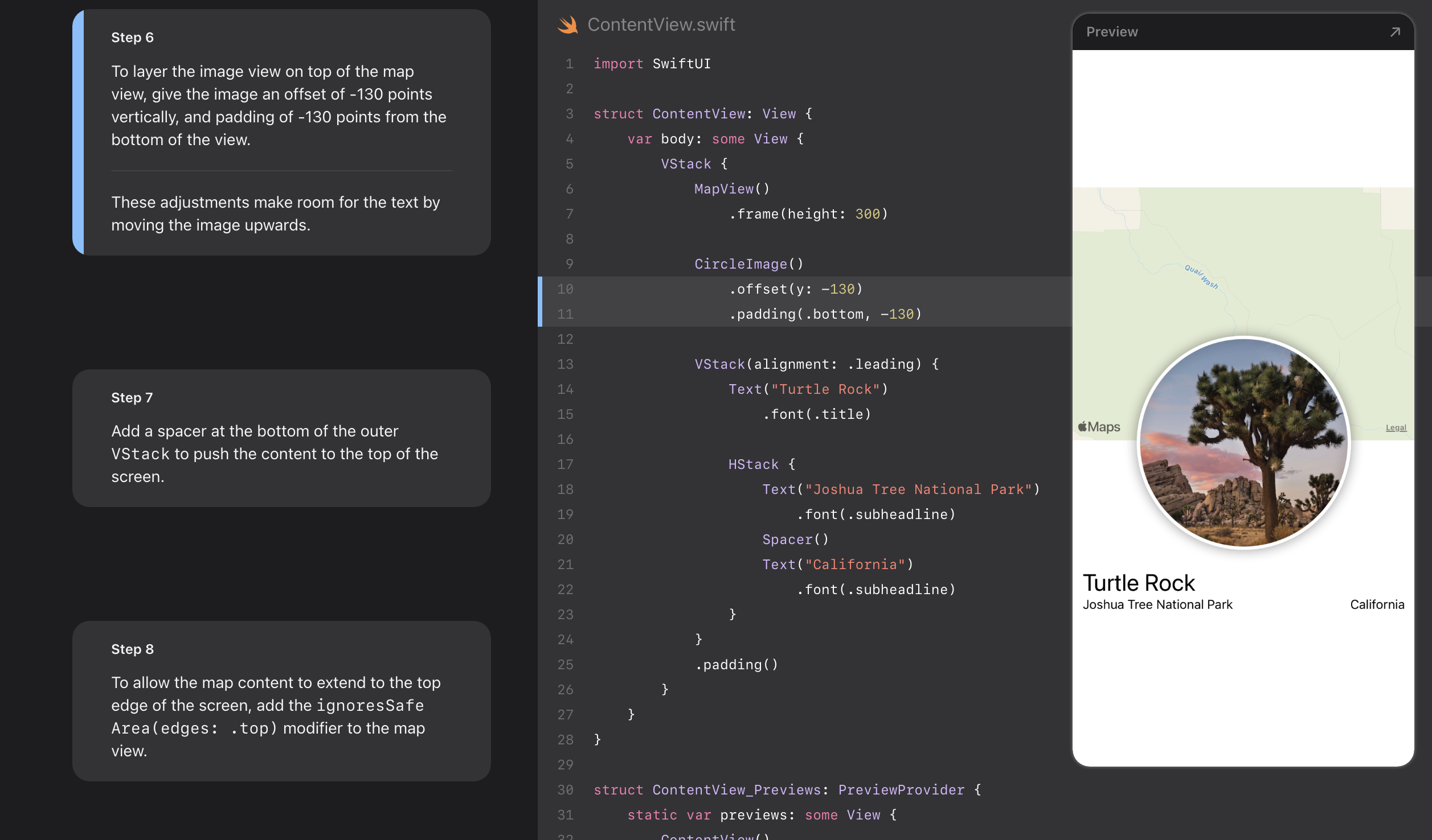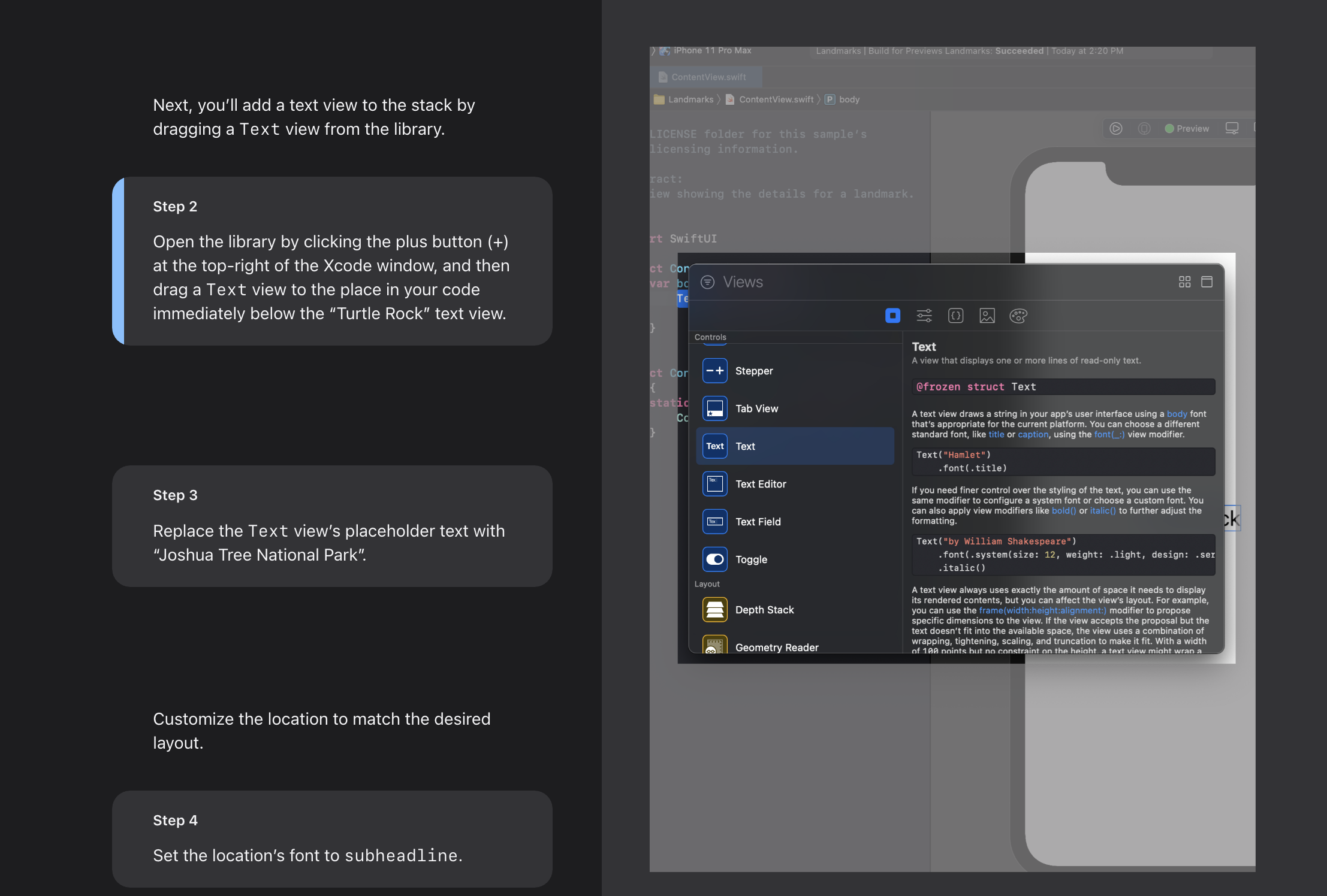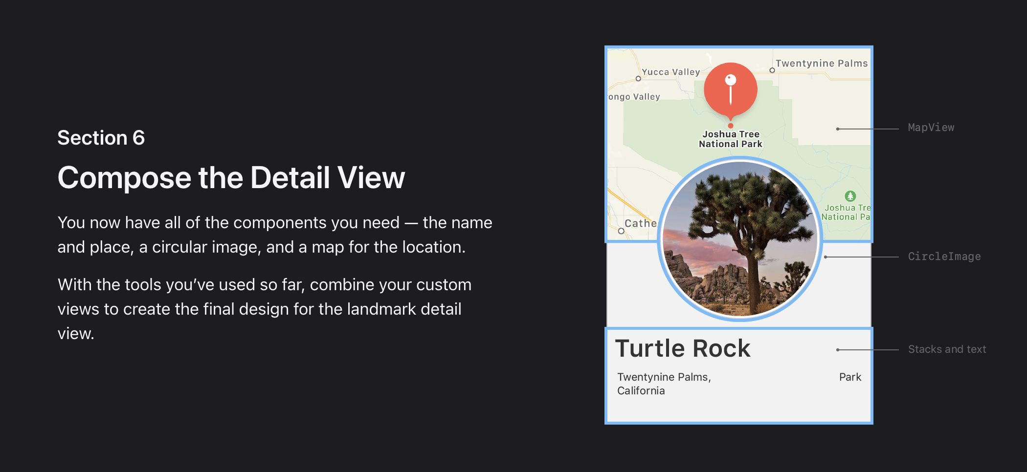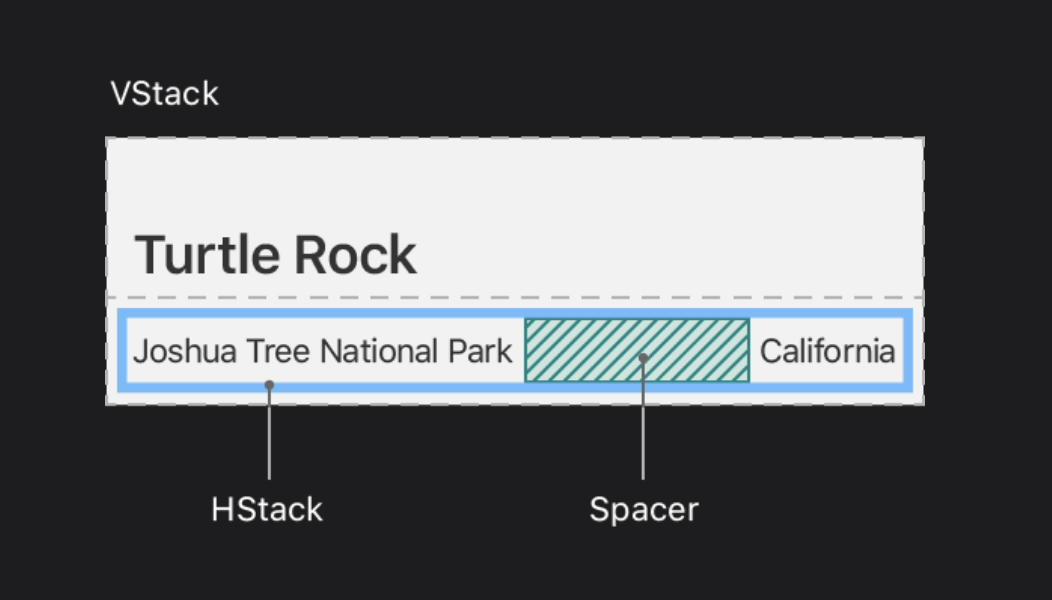 - Landmarks uses stacks to combine and layer the image and text view components.