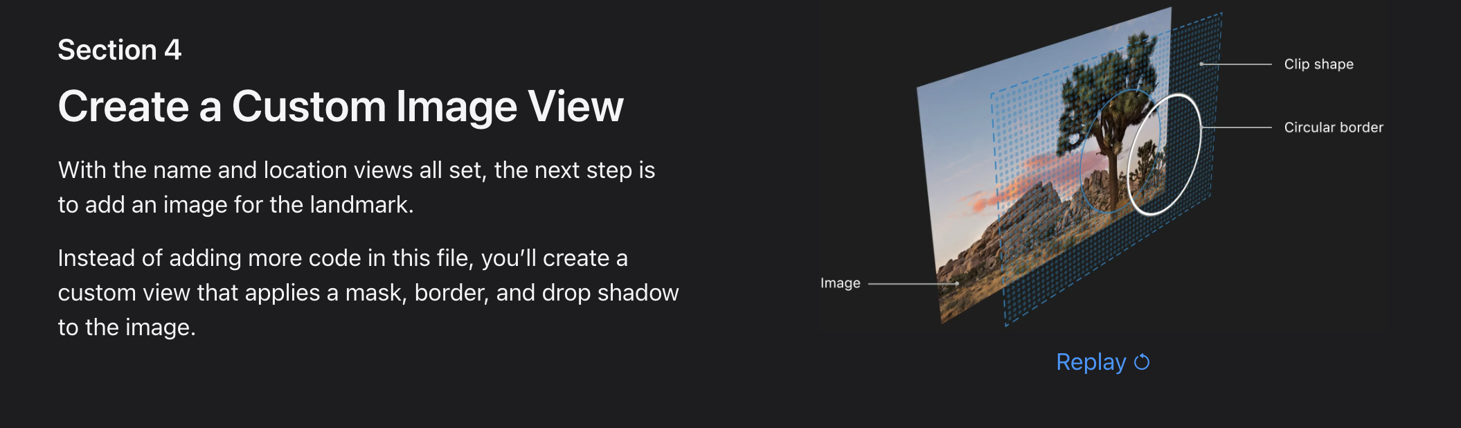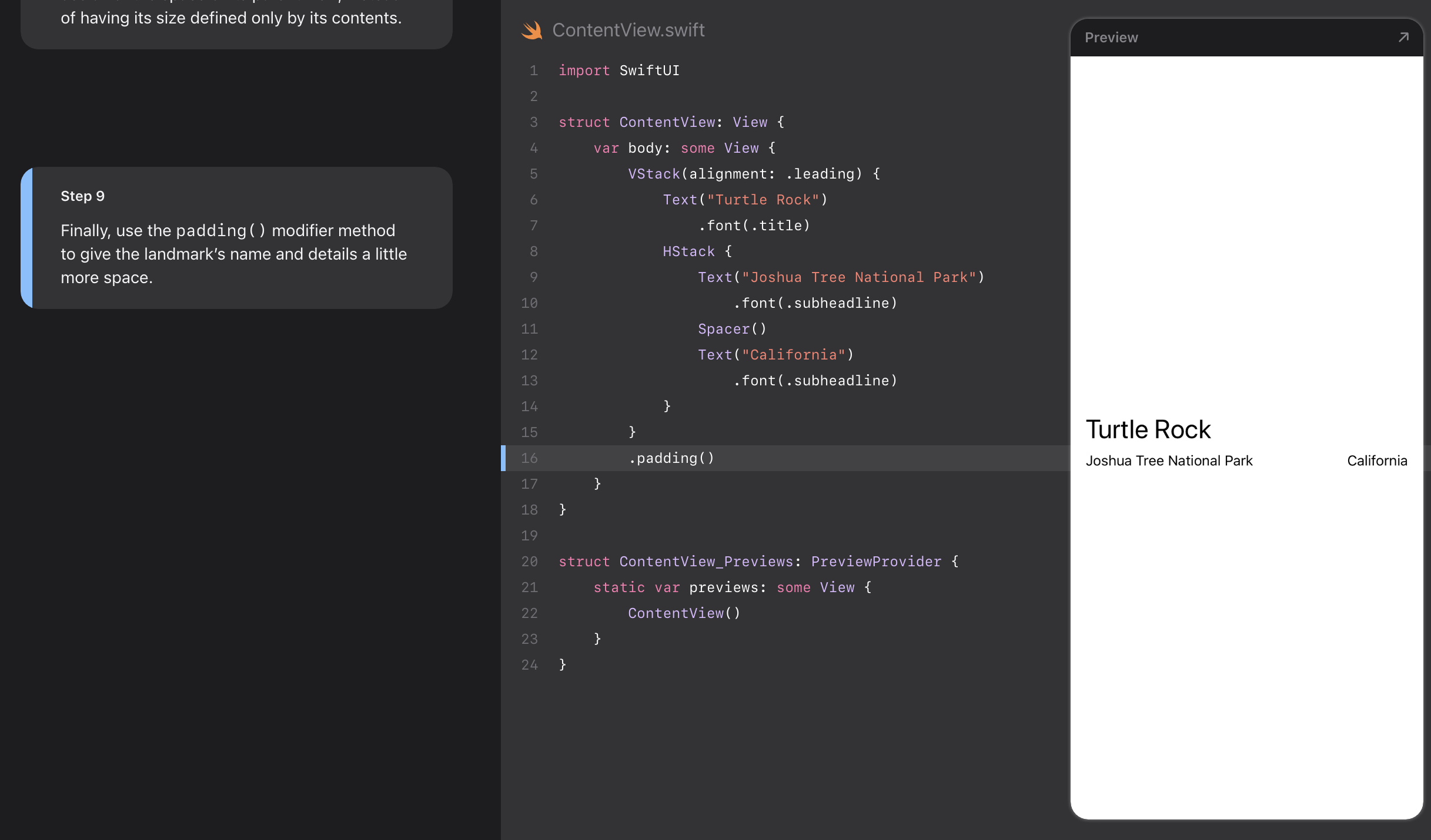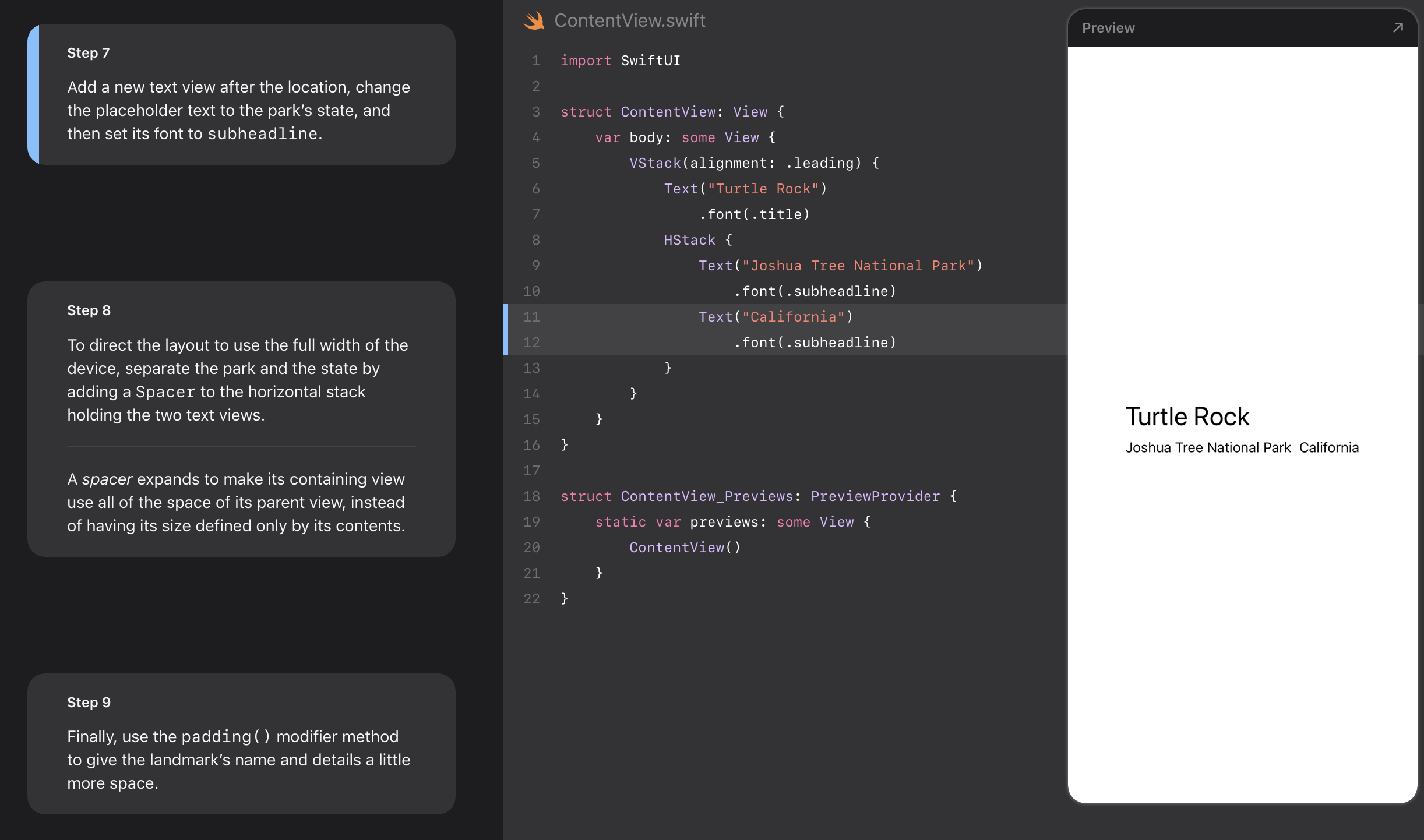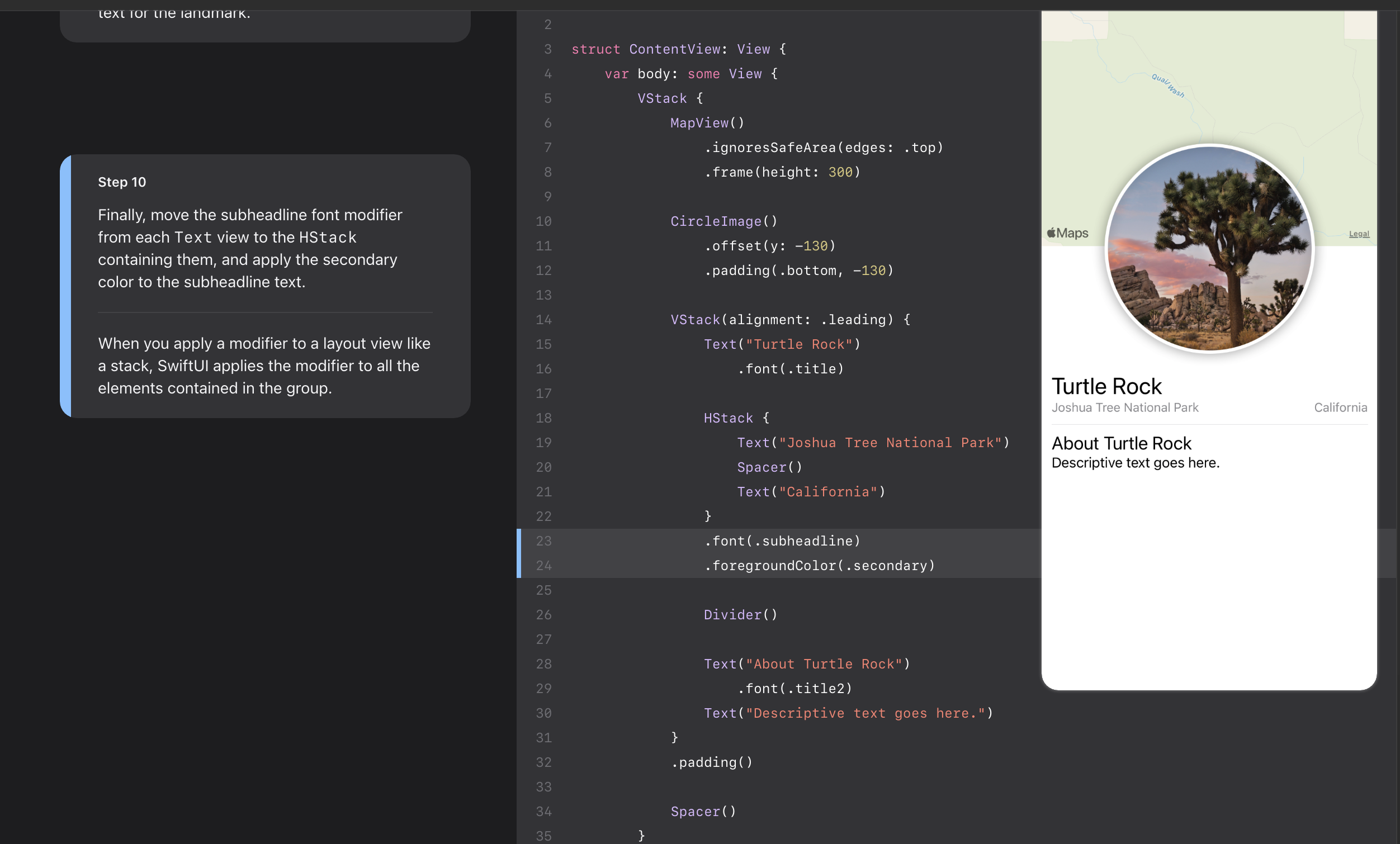 - Landmarks uses stacks to combine and layer the image and text view components.