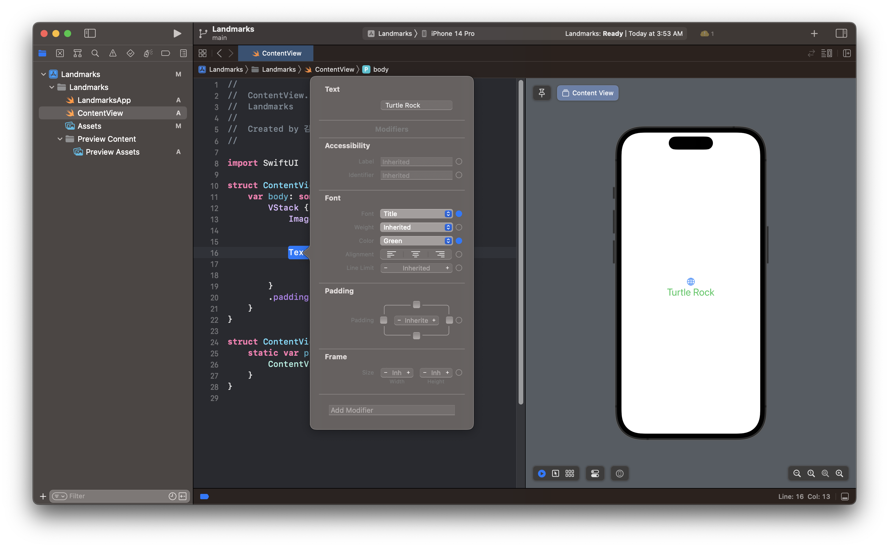 - ์ปค๋งจ๋ + ํด๋ฆญํ๋ฉด ์ ๋ ๊ฒ ๋จ๋๋ฐ, ์ ๊ธฐ์ SwiftUI Inspector๋ฅผ ์ ํํ์ญ์ผ. ๋๋ฅด๋ฉด ์ธ์คํํฐ๊ฐ ๋จ๋๋ฐ, Turtle Rock์ด๋ผ๊ณ ๋ฐ๊ฟ์ฃผ๊ณ Title๋ก ์ค์ ํด์ค๋๋ค. ์ง์ ์ฝ๋๋ก ์ถ๊ฐํด๋ณด๊ธฐ : .forgroundColor(.green)