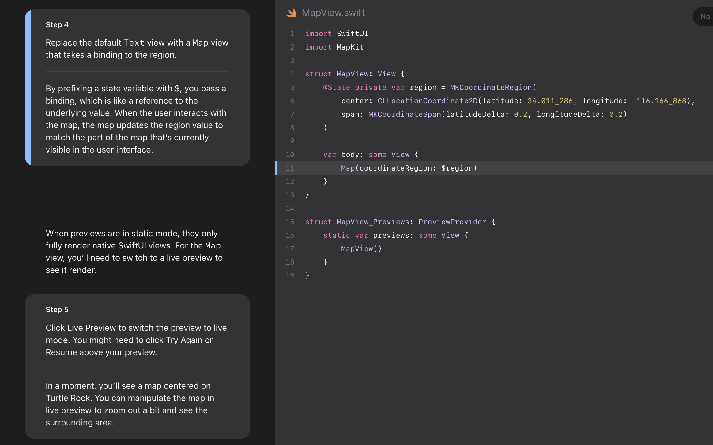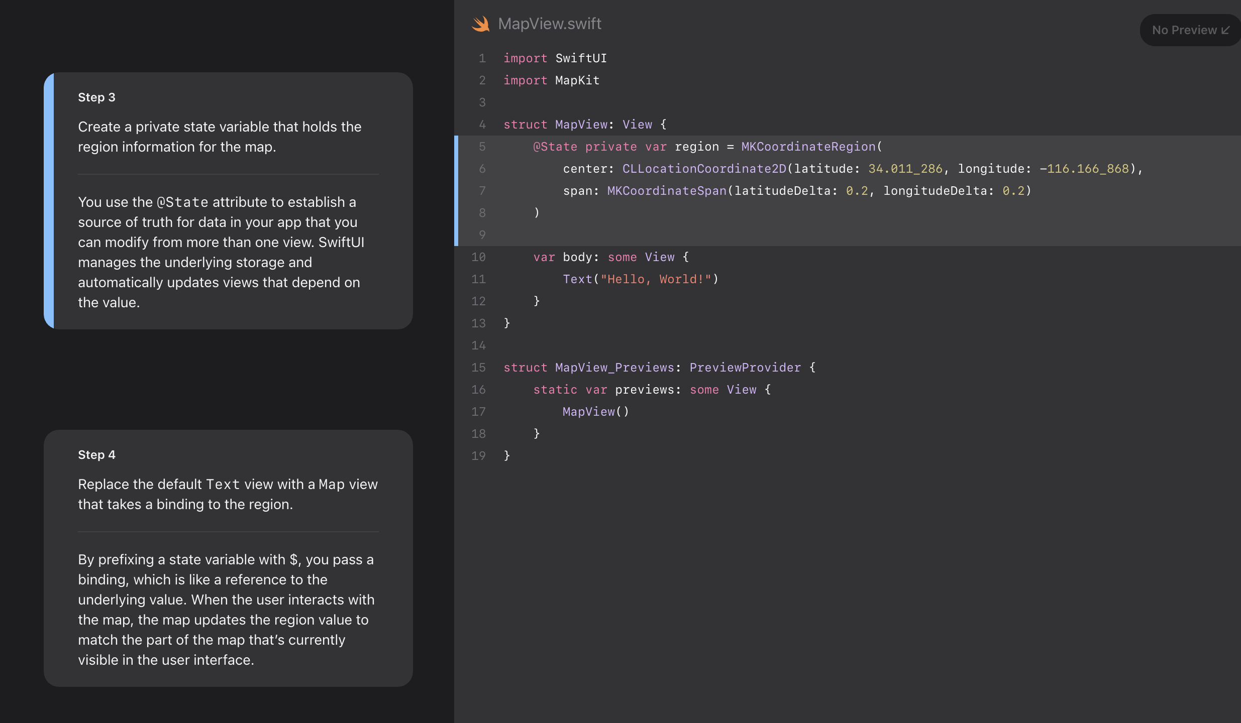 - By prefixing a state variable with $, you pass a binding, which is like a reference to the underlying value. When the user interacts with the map, the map updates the region value to match the part of the map that’s currently visible in the user interface.
