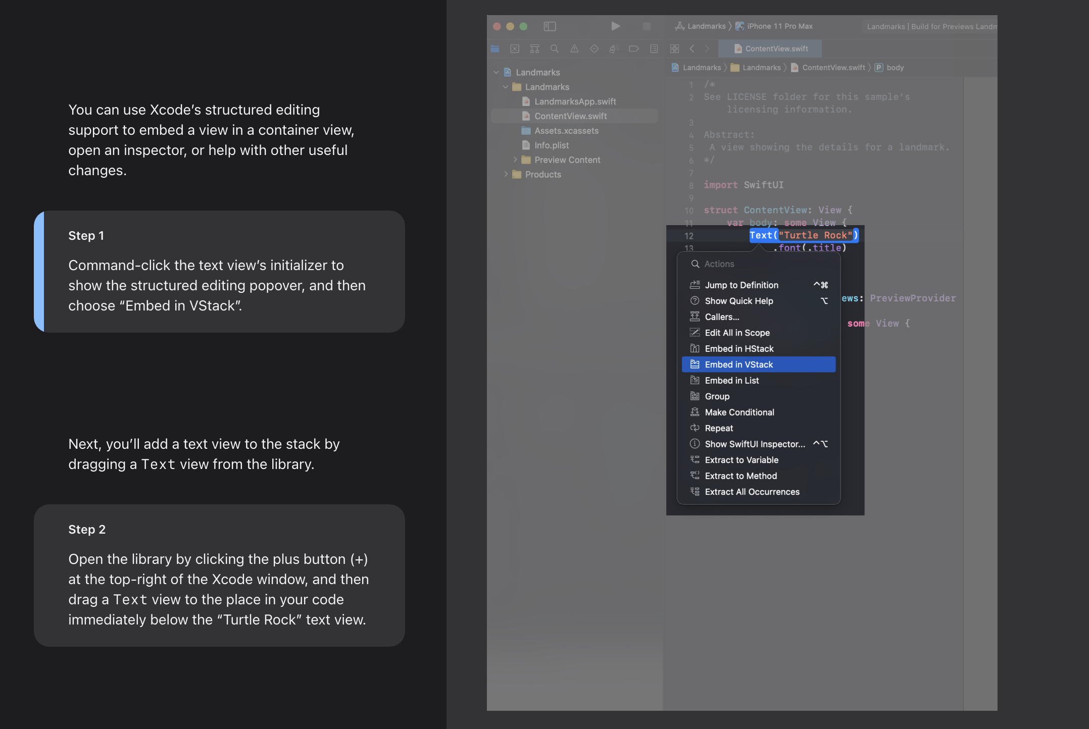 ์, 1๋ฒ. ์ปค๋งจ๋ + ํด๋ฆญ์ผ๋ก ํ์ค๋ฒ ๋์ฐ๊ณ , Embed in VStack์ ์ ํํ๋ค.