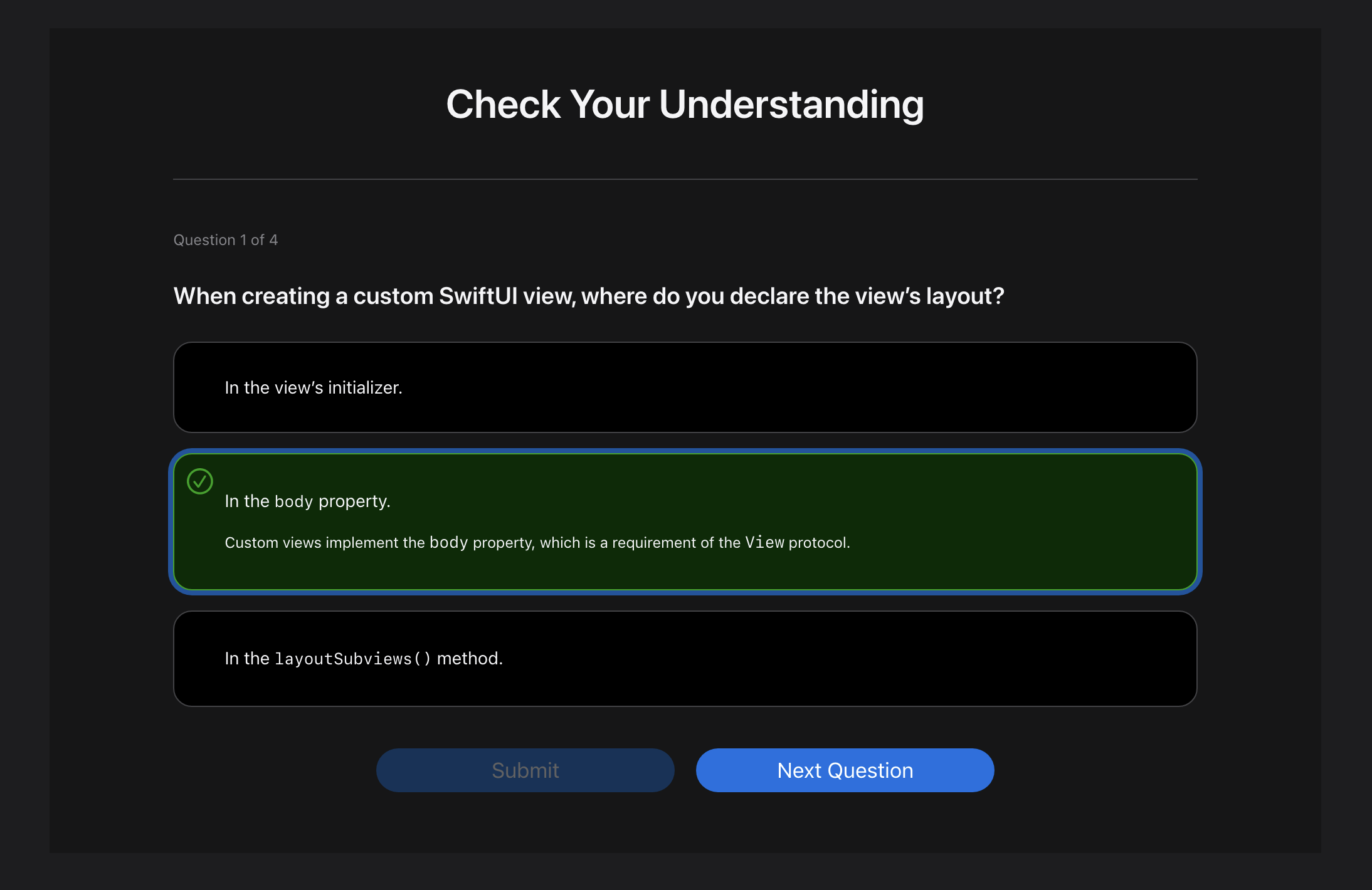 -> ์ฒซ๋ฒ์งธ ๊ตฌ์กฐ๋ View๋ผ๋ ํ๋กํ ์ฝ์ conform ํฉ๋๋ค. ๊ทธ๋ฆฌ๊ณ ๋ทฐ์ ๋ด์ฉ์ด๋ ๋ ์ด์์์ ๊ฐ๊ณ ์ด์จ์.