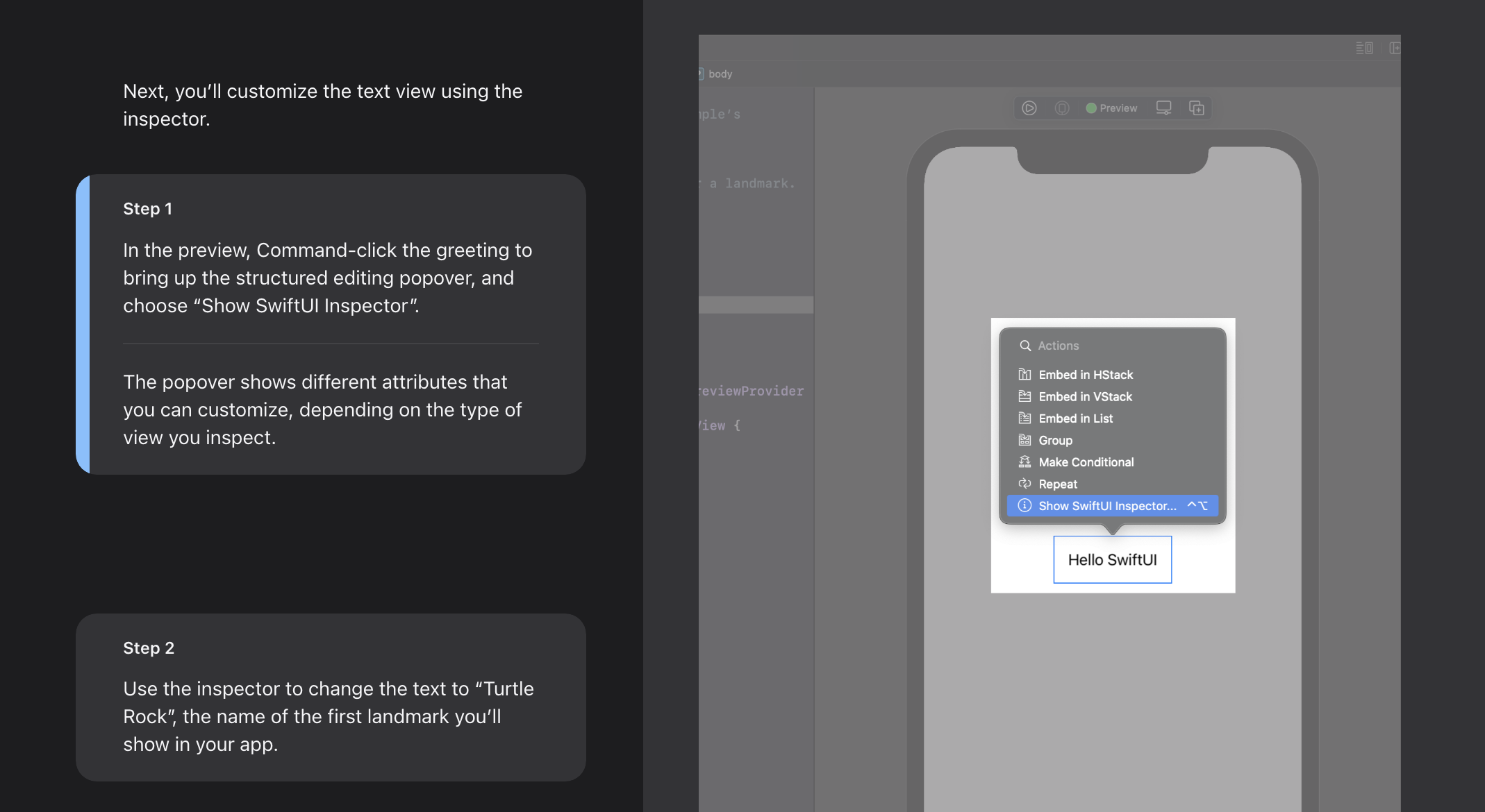 By default, SwiftUI view files declare two structures. The first structure conforms to the View protocol and describes the view’s content and layout. The second structure declares a preview for that view.