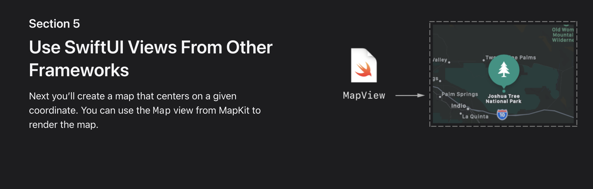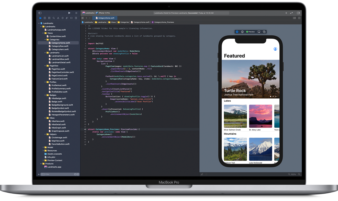 - To add a map to the view, you’ll include a standard MapKit component. As you refine the view’s design, Xcode provides real-time feedback so you can see how those changes translate into code.