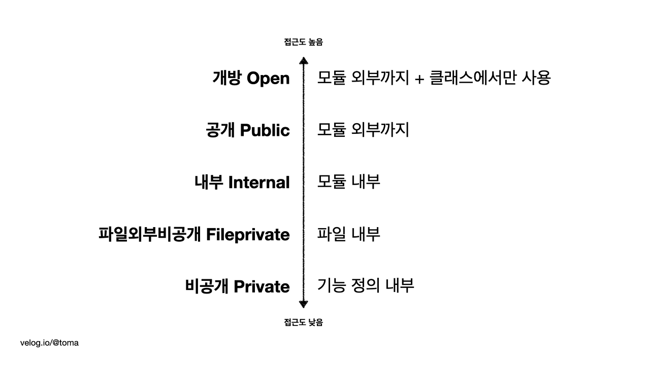 - open, public, internal, fileprivate, private 5๊ฐ์ง๊ฐ ์์ต๋๋ค !