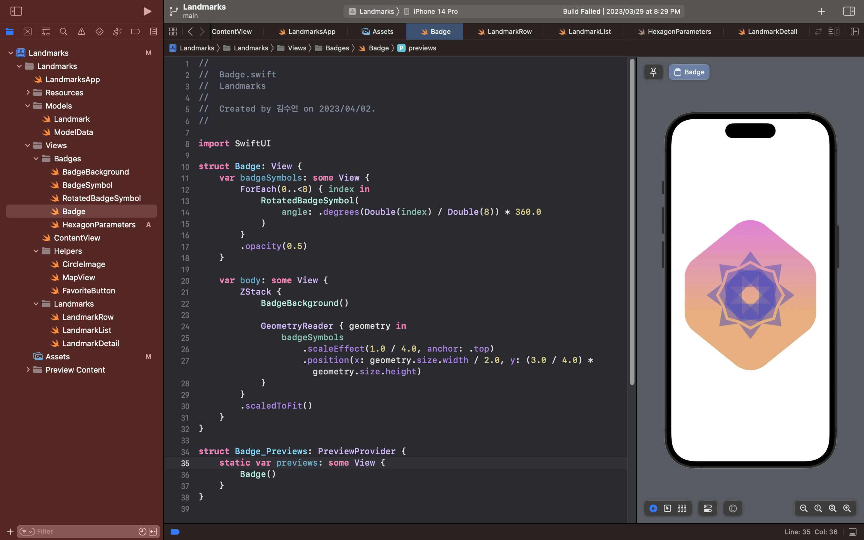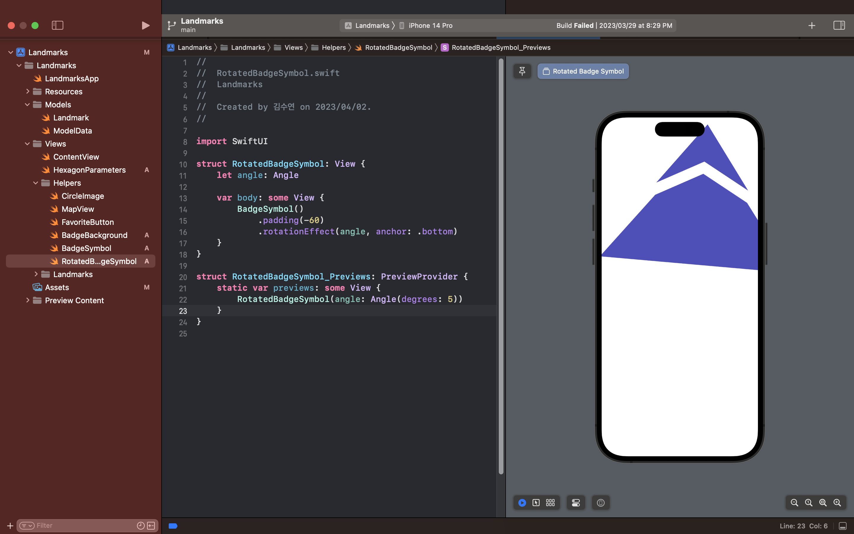 6. ๋ค์์ผ๋ก, ํ์ ๋ ์ฌ๋ณผ์ ์บก์ํํ๊ธฐ ์ํด ์๋ก์ด RotatedBadgeSymbol ๋ทฐ๋ฅผ ์์ฑํฉ๋๋ค.
