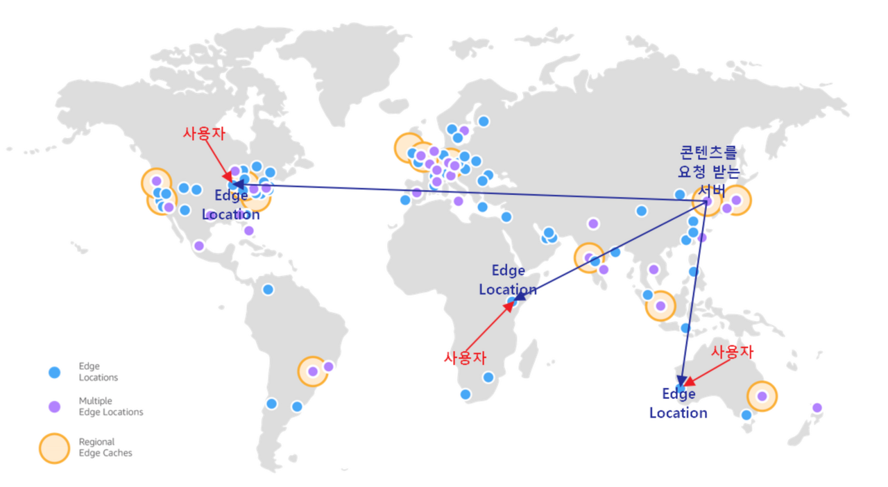 - CloudFront๋ฅผ ์ด์ฉํ๋ฉฐ ์ฌ์ฉ์๊ฐ ๊ฐ๊น์ด ๊ณณ์ ์บ์์๋ฒ๊ฐ ์์นํ๊ณ , ์ฌ์ฉ์๊ฐ ์ฝํ ์ธ ๋ฅผ ์์ฒญ ์ ๊ฐ๊น์ด ๊ณณ์ ์๋ ์บ์์๋ฒ๊ฐ ์๋ตํด์ฃผ๋๋ฐ ์ด๋ฌํ AWS์ CloudFront์ ์บ์์๋ฒ๋ฅผ ๋ณดํต ์ฃ์ง ๋ก์ผ์ด์ ์ด๋ผ๊ณ ํจ.