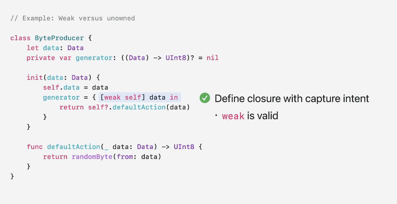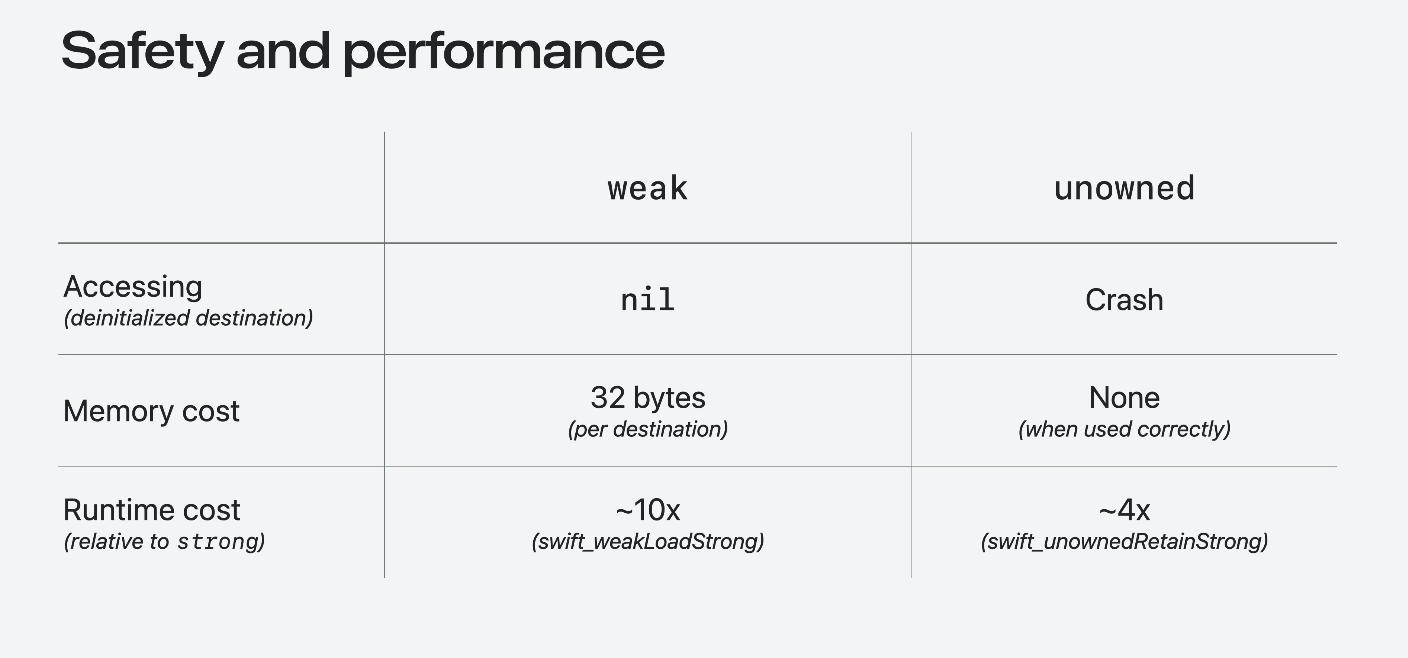 • weak/unowned ์ ํ์ ์๋ช ์ ๋ฐ๋ผ ๊ฒฐ์