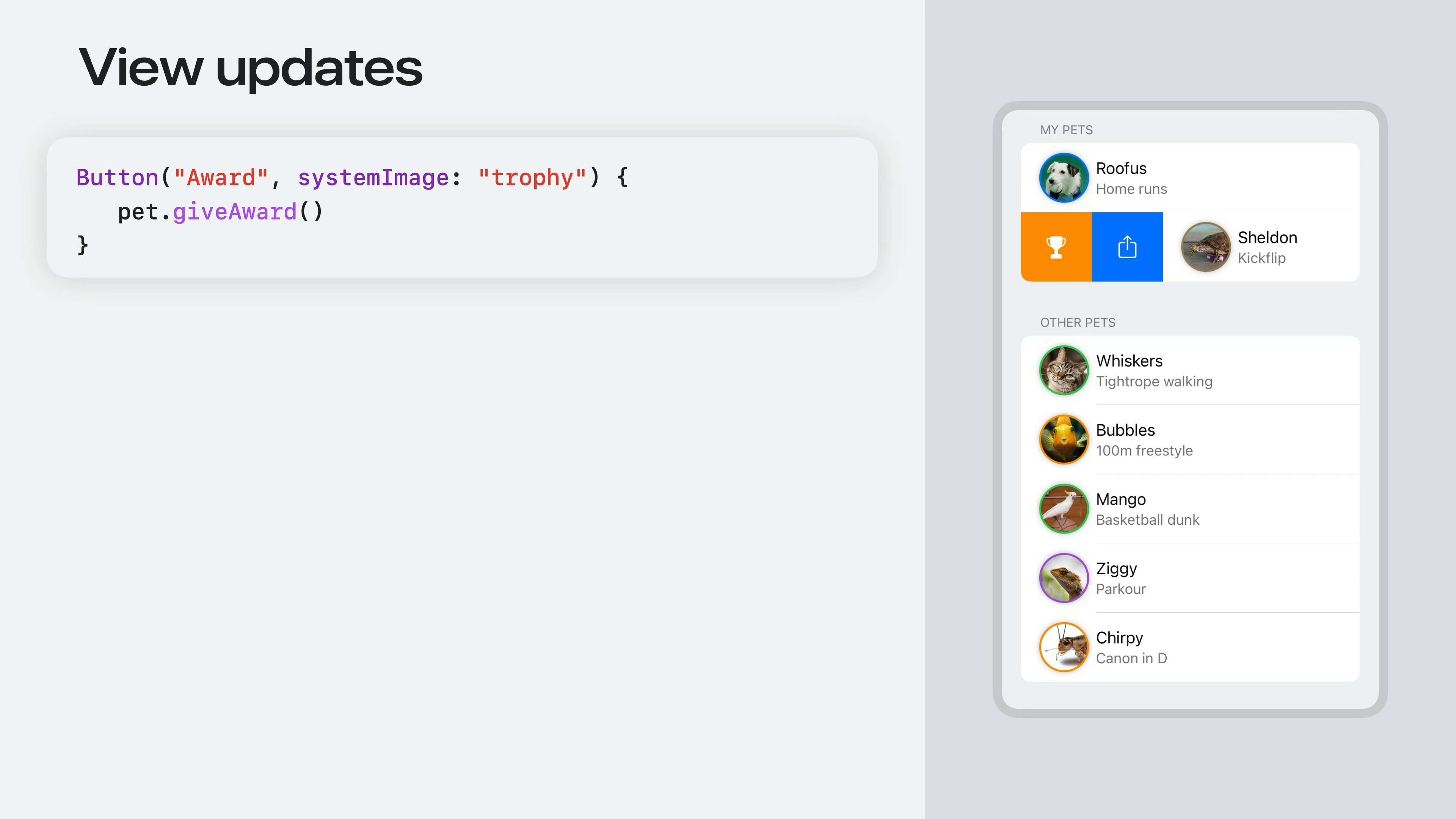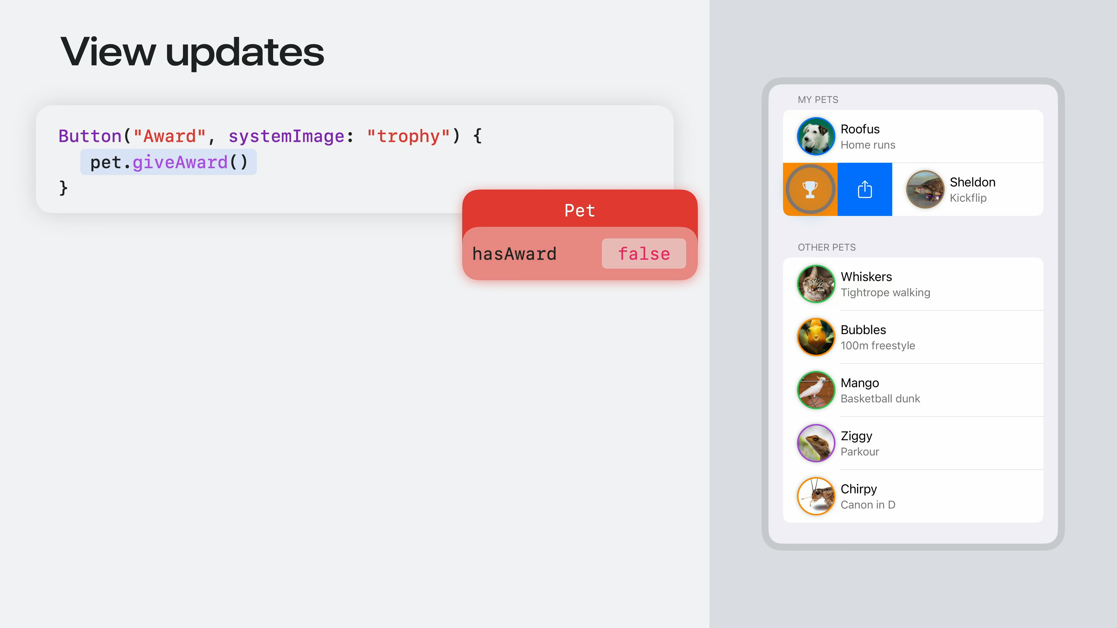 - swiftui๋ ์ ๋ฐ์ดํธ๋ pet์ผ๋ก ์ด ๋ทฐ์ body๋ฅผ ๋ค์ ํธ์ถ